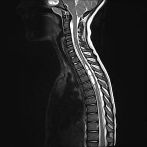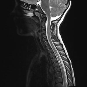 Fig 1. MRI T2 sagittal cervical spine. Downward displacement of the cerebellar tonsils.