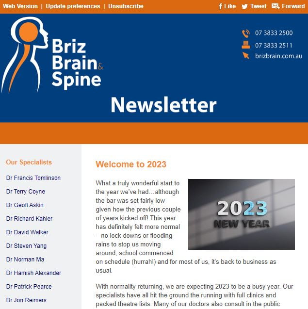 It looks like 2023 will be a busy one for Briz Brain & Spine with full clinics and theatre lists already being a feature. We've just released our first newsletter for the year which includes an overview of some of our plans for the year as well as a heart-warming story about one of young patients who really has gone full circle. Read the latest edition here.
